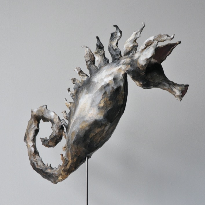 Terwijl de oceaan denkbeeldig door me heen stroomt, ontstaan negen zeepaardjes. Ieder voor zich is uniek; bij elkaar geplaatst willen ze communiceren en vormen één geheel. Afhankelijk van de plaatsing steeds weer anders.